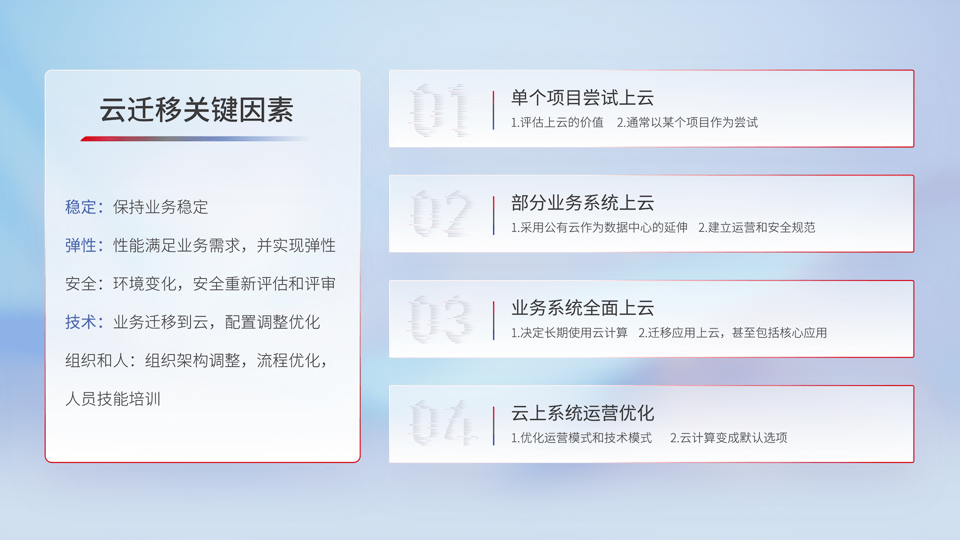 结合实际业务,,,从规划设计、、、云平台选型、、、、云原生改造、、数据迁移、、、集成交付,,,,迁移全过程为客户识别最佳上云路径,,,,做好风险识别管理,,设计网络架构、、身份权限、、、、安全审计合规、、、、操作审计、、日志审计、、监控告警策略、、、多站点容灾设计等,,,对云上基础设施进行整体规划,,,提升IT治理水平,,,以满足弹性、、、、高可用、、、、高性能的需求。。。。
